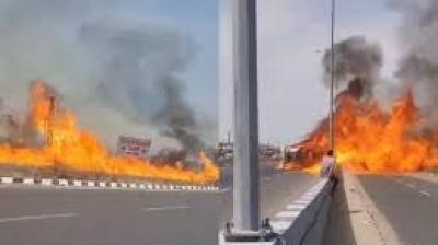 तेल टैंकर पलटते ही लगी आग, लपटों में घिरा 200 मीटर इलाका