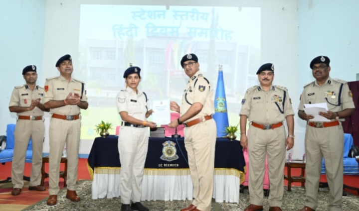 ग्रुप केन्द्र, के.रि.पु.बल नीमच के मैन्स क्लब में सोमवार को स्टेशन स्तरीय हिंदी दिवस समारोह का आयोजन किया गया। कार्यक्रम की अध्यक्षता  संदीप दत्ता, पुलिस महानिरीक्षक ,सी.टी.सी. नीमच ने की । हिंदी दिवस के उपलक्ष्य में स्टेशन पर  14 – सितंबर 2025 से 29-सितंबर-2025 तक हिंदी पखवाड़ा मनाया गया, जिसका सोमवार को समापन हुआ । हिंदी पखवाड़े के उपलक्ष्य में अधिकारियों की हिंदी डिक्टेशन प्रतियोगिता एवं अन्य कार्मिकों के लिए हिंदी व्यवहार प्रतियोगिता, हिंदी कार्यशाला, हिंदी टिप्पणी , आलेखन प्रतियोगिता एवं हिंदी टंकण जैसी प्रतियोगिताओं का आयोजन किया गया। इन प्रतियोगिताओं में प्रथम, द्वितीय एवं तृतीय स्थान प्राप्त 84 कार्मिकों को सराहना स्वरूप मुख्य अतिथि ने प्रशस्ति पत्र देकर सम्मानित किया और उनके लिए नकद पुरस्कारों की घोषणा की । इस अवसर पर मुख्य अतिथि  संदीप दत्ता ने  गोविन्द मोहन, भा.प्र.से. केन्द्रीय गृह सचिव द्वारा जारी अपील एवं  जी.पी. सिंह, भारतीय पुलिस सेवा, महानिदेशक, केरिपुबल का राजभाषा संदेश पढ़ कर सुनाते हुए अधिक से अधिक कार्यालयिन काम-काज हिंदी में करने के  अपील की। उन्‍होने हिंदी दिवस के अवसर पर सभी प्रतिभागियों को शुभकामनाएं भी दीं। कार्यक्रम स्टेशन स्तर पर आयोजित किया गया जिसमें  सुरेन्द्र कुमार, उप महानिरीक्षक, ग्रुप केंद्र नीमच,   प्रमोद कुमार साहु, कमाण्डेंन्ट, ग्रुप केंद्र नीमच, सहित कैम्‍पस स्थित के.रि.पु.बल के सभी संस्थानों के राजपत्रित अधिकारी एवं सभी विजेता अधिकारी व कार्मिक मौजूद रहे।  जी. दिनेश, द्वितीय कमान अधिकारी, ग्रुप केन्द्र ने आभार व्यक्त किया।