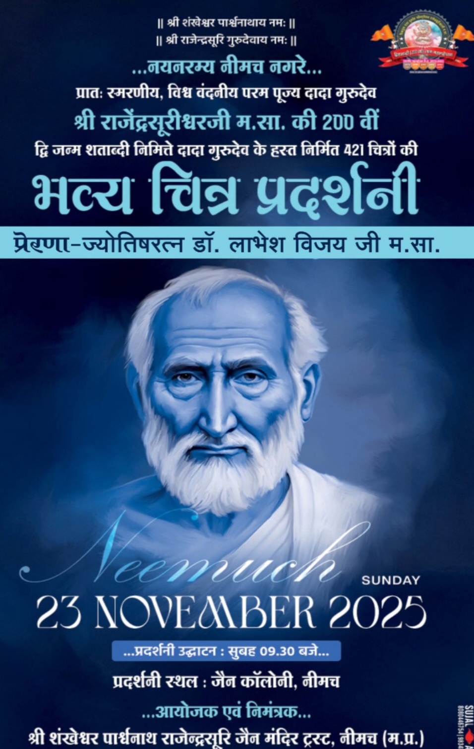 नयन रम्य नीमच नगरे… प्रातः स्मरणीय, विश्व वंदनीय परम पूज्य दादा गुरुदेव श्री राजेंद्र सूरीश्वर जी म.सा. की 200 वीं द्वि जन्म शताब्दी निमित्ते दादा गुरुदेव के हस्त निर्मित 421 चित्रों की भव्य चित्र प्रदर्शनी का ज्योतिष रत्न डॉ. लाभेश विजय जी म.सा. की सद् प्रेरणा से 23 नवंबर 2025 रविवार को सुबह 9:30 बजे जैन कॉलोनी नीमच में उद्घाटन होगा।